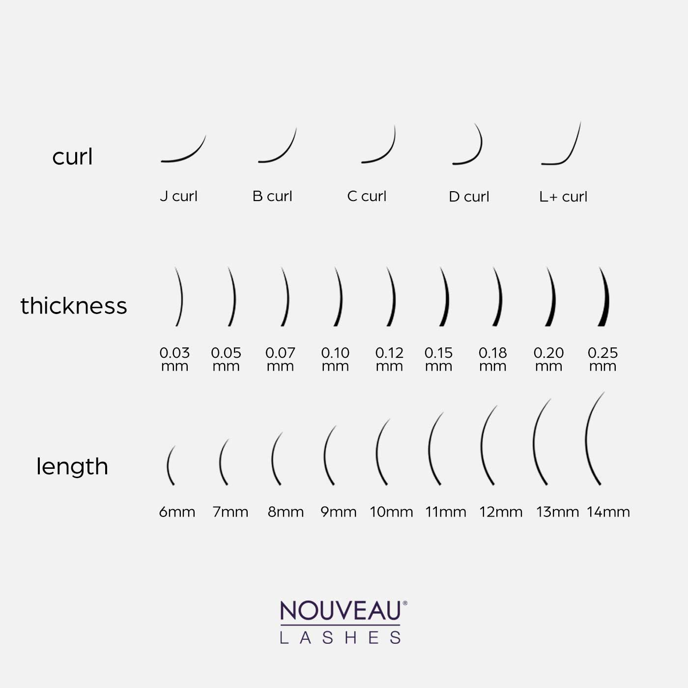 The 0.20mm diameter Nouveau Lashes Flat Lash Extensions have an innovative ellipse shape. This shape means there is a larger surface area coming into contact with the natural lash, creating a stronger bond. They are available in both C and D curls.