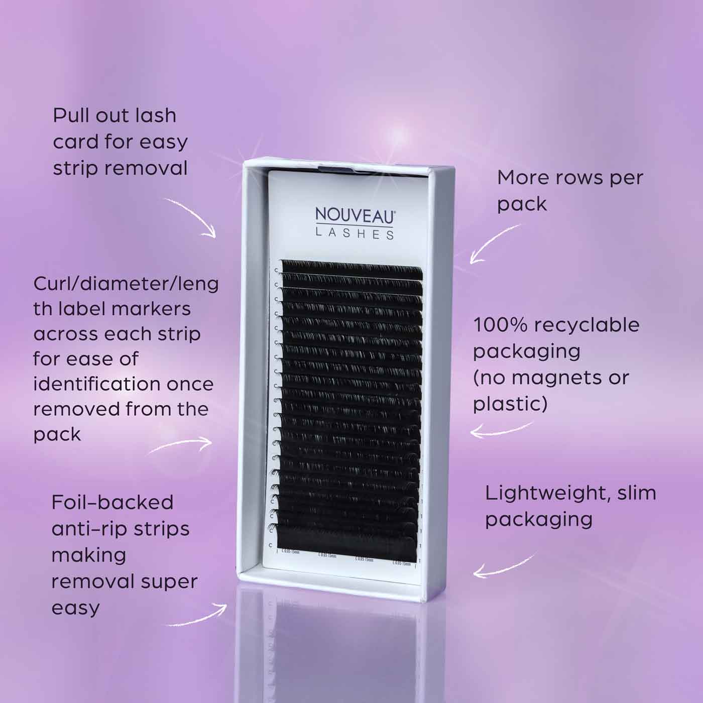 Everything about the Nouveau Lashes Lash Extensions range has been crafted by experts with busy lash artists in mind. The lash card pulls out of the box for easy strip removal, whilst foil-backed, anti-rip strips make removal super easy. Each strip features curl, diameter and length label markers for easy identification when removed from the pack.