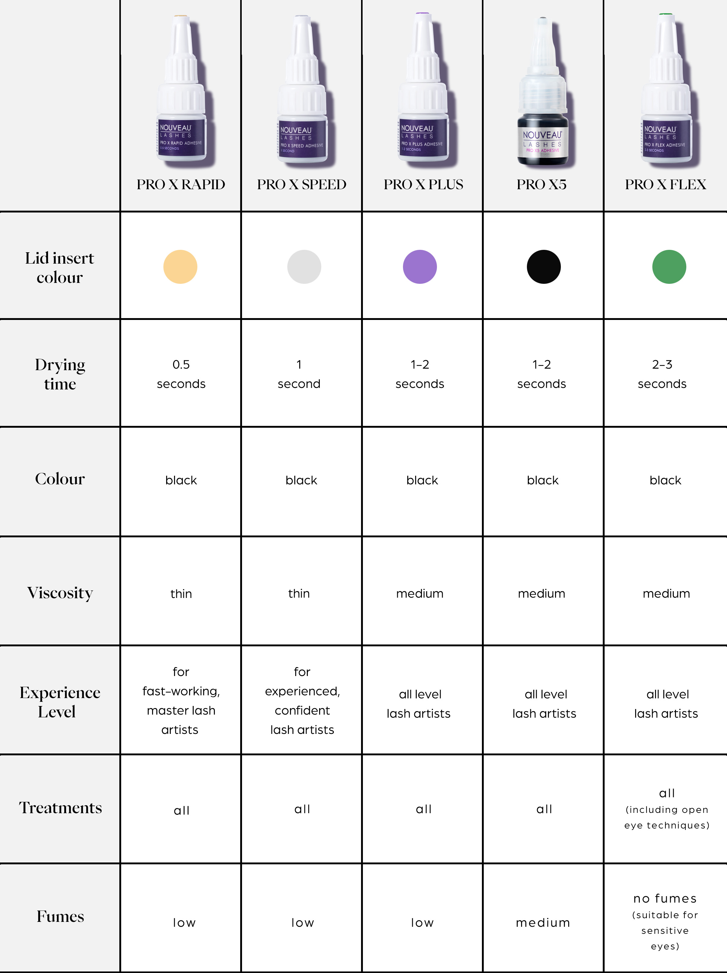 The entire Nouveau Lashes Pro X adhesive range are made from cosmetic-grade ingredients and are oil, water and heat resistant once cured.