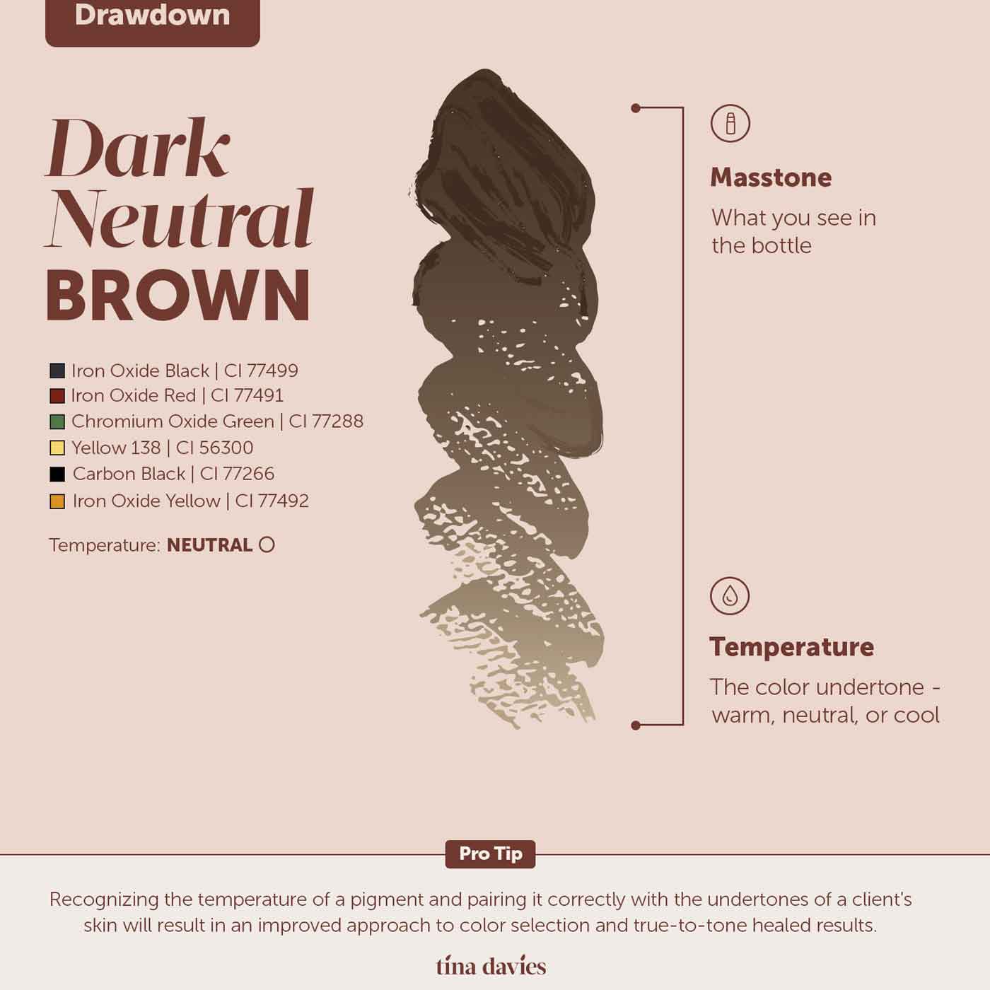 This pigment has a neutral undertone. It’s best suited to clients with Fitzpatrick skin types 2-6, and those with black hair or medium, ash or dark brown, brunettes.