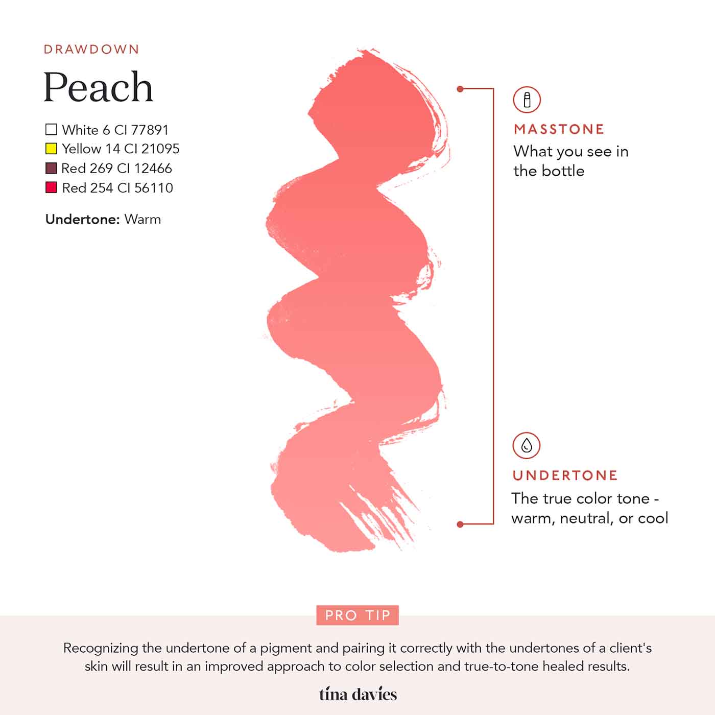 The Tina Davies I Kiss Ink Lip Pigments Peach is a warm, peachy shade. It can be used alone or mixed with other I Kiss Ink pigments as a warm modifier.